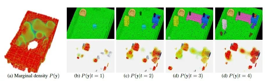 图1.在Copier room数据集上的分割结果显示具有相似的时间范围表面块的分组。分割精度取决于表面块的数量(上图)。使用最佳簇大小对所有时空观测进行分割,发现静态和动态场景组件(下图)。