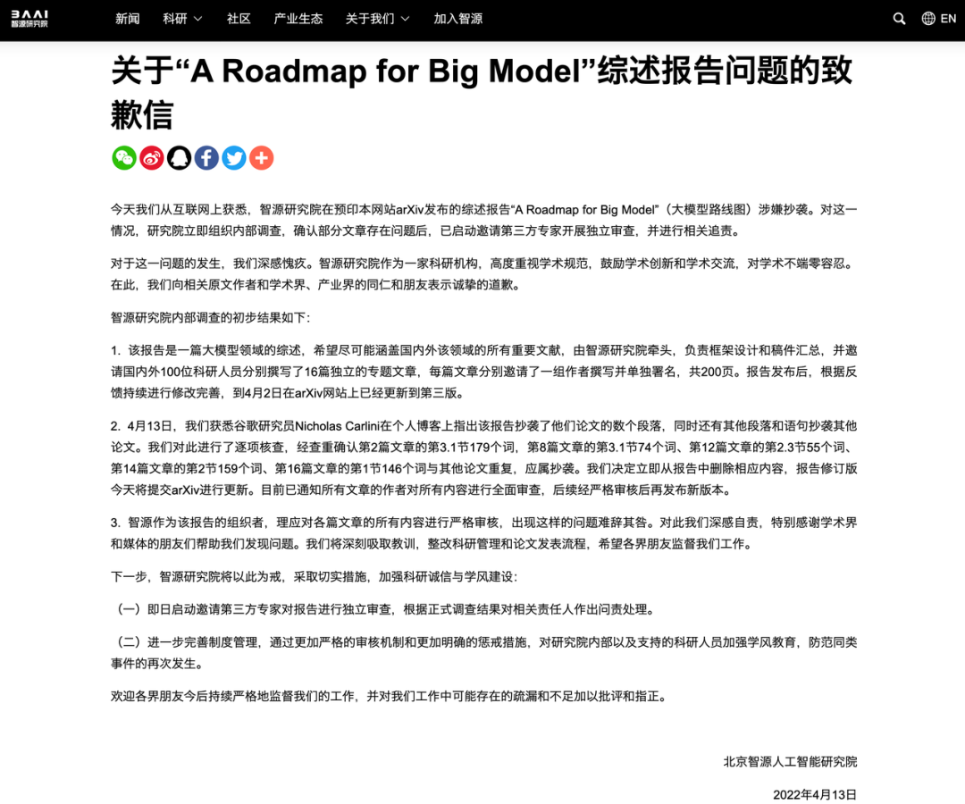 针对质疑,4 月 13 日,北京智源人工智能研究院发布了《关于 “A Roadmap for Big Model” 综述报告问题的致歉信》,并表示:「对这一情况,研究院立即组织内部调查,确认部分文章存在问题后,已启动邀请第三方专家开展独立审查,并进行相关追责。」