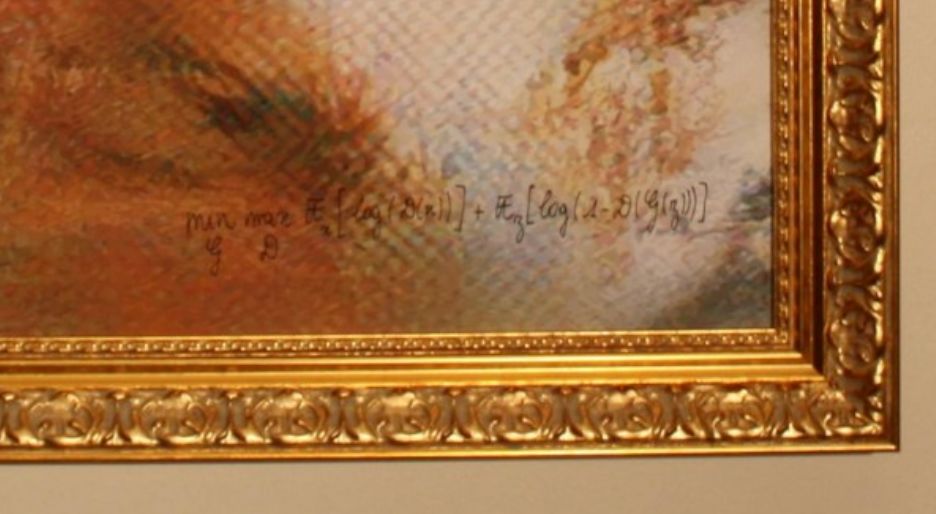最后拍卖的画作有一个非常有趣的点,它并没有署名任何艺术家或者程序开发者,而是在右下角写下了机器学习任务中的目标函数。如果你完全不懂机器学习,那你需要知道的是正是这样的一个GAN的数学公式创造了面前这幅天价的画作。
