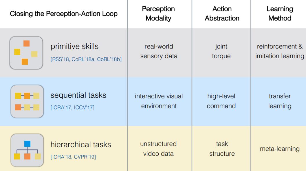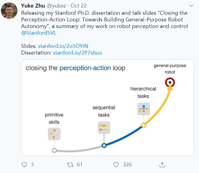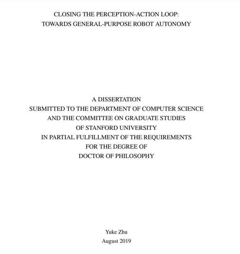 【导读】斯坦福大学李飞飞的得意门生朱玉可博士今年 8 月取得斯坦福大学博士学位,并将于 2020 年秋季加入德克萨斯大学奥斯汀分校(UT-Austin)担任计算机科学助理教授。他的博士论文关于为能够理解并与现实世界交互的通用机器人构建智能《Closing the Perception-Action Loop: Towards General-Purpose Robot Autonomy》在其个人主页日前公开,感兴趣的读者可以参看。