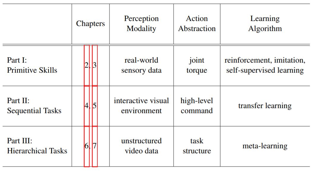 概括性而言,我们介绍了在三个抽象层次上剖析感知-动作循环的工作(也参见上表):首先,学习原始技能,将原始的感知信息转换为驱动机器人动作的控制命令(第2章和第3章);