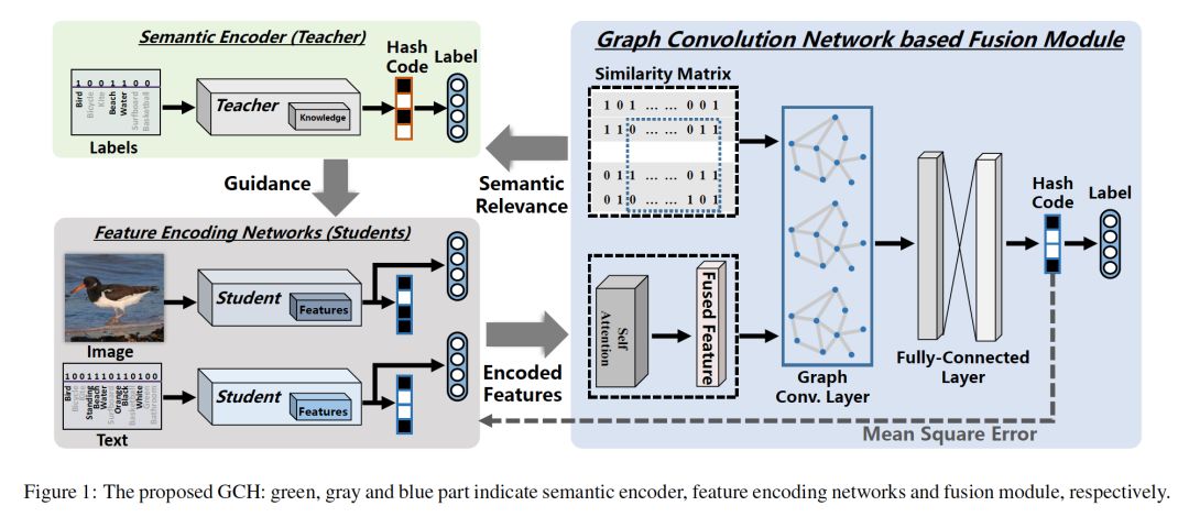 摘要:基于深度网络的跨模态检索近年来取得了显著的进展。然而,弥补模态差异,进一步提高检索精度仍然是一个关键的瓶颈。本文提出了一种图卷积哈希(GCH)方法,该方法通过关联图学习模态统一的二进制码。一个端到端深度体系结构由三个主要组件构成:语义编码模块、两个特征编码网络和一个图卷积网络(GCN)。我们设计了一个语义编码器作为教师模块来指导特征编码过程,即学生模块,用于语义信息的挖掘。此外,利用GCN研究数据点之间的内在相似性结构,有助于产生有区别的哈希码。在三个基准数据集上的大量实验表明,所提出的GCH方法优于最先进的方法。