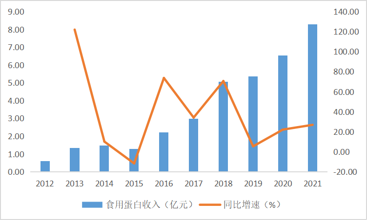以植物肉为首的下游旺盛的市场需求直接带动豌豆蛋白生产企业业务快速增长。以双塔食品为例,2012-2021年,双塔食品豌豆蛋白业务的收入规模由0.60亿元扩大至8.29亿元,CAGR达33.5%。