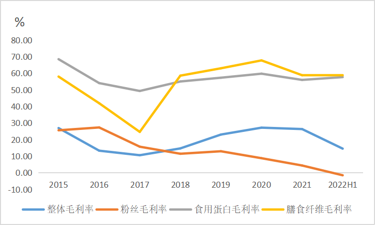 推动收入增长的同时,豌豆蛋白、膳食纤维等高附加值业务的扩张也进一步优化了双塔食品的盈利水平。从毛利率来看,豌豆蛋白、膳食纤维的毛利率长期高于粉丝,2018年-2022H1,豌豆蛋白、膳食纤维两项业务的毛利率均达50%以上,呈逐年上升的趋势。