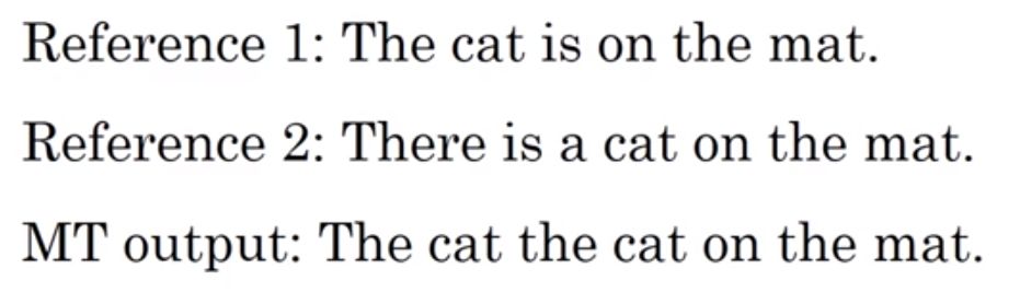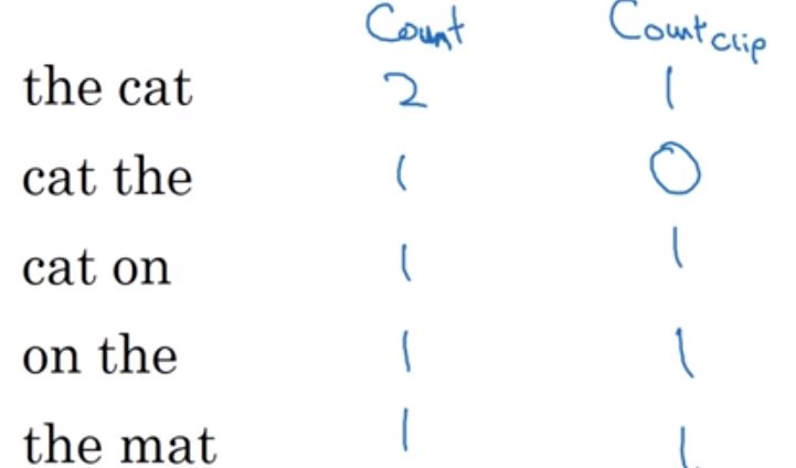 其中设count为机器翻译的句子的词在本句子中出现的词数,count_clip为该句子中的词在Reference中对应的词出现的词数(如果两个都有,则选取最大的)评分为count_clip / count