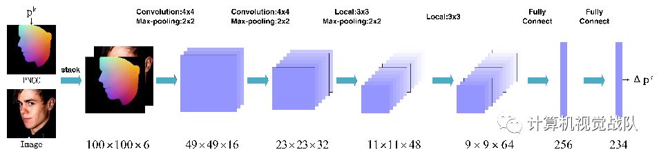 纯学习方法:这类方法使用强大的CNNs模型从人脸图像中直接预测关键点位置。在早期的工作中(Sun, Y., Wang, X., Tang, X.: Deep convolutional network cascade for facial point detection. In: IEEE Conference on Computer Vision and Pattern Recognition, pp. 3476–3483 (2013)),它以级联的方式预测了五个人脸关键点。在第一层,它应用一个包含四个卷积层的CNN模型(下图)来预测由面部边界框确定的人脸图像的关键点位置。然后,几个浅层网络对每个点进行局部细化。