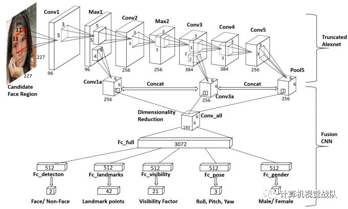 从那以后,在两个方向上都比早起某些工作有一些改进。在第一个方向上,(Zhang, Z., Luo, P., Loy, C., Tang, X.: Facial landmark detection by deep multi-task learning. In: European Conference on Computer Vision, Part II, pp. 94–108(2014)和Zhang, Z., Luo, P., Loy, C.C., Tang, X.: Learning deep representation for face alignment with auxiliary attributes. IEEE Transactions on Pattern Analysis and Machine Intelligence 38(5), 918–930 (2016))利用多任务学习的思想来提高性能。直觉是,多个任务可以共享相同的表示,它们的联合关系将提高单个任务的性能。例如,多任务学习与CNN模型相结合,共同预测面部特征、面部头部姿态、面部属性等。在该工作(Ranjan, R., Patel, V.M., Chellappa, R.: Hyperface: A deep multi-task learning framework for face detection, landmark localization, pose estimation, and gender recognition. CoRR abs/1603.01249 (2016). URL http://arxiv.org/abs/1603.01249)提出了一个类似的多任务CNN框架,以联合执行人脸检测、地标定位、姿态估计和性别识别。不同的是它结合了多个卷积层的特征,以利用粗特征表示和精细特征表示。