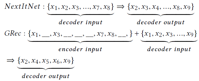 在介绍最终的解决方案之前,首先需要研究一些结合未来上下文的传统方法。然后,我们阐明了这些方法在用于生成任务时的潜在缺陷。在分析的基础上,我们提出了基于间隙填充(或填空)的编码器-解码器生成框架,即GRec。下面,我们将使用NextItNet中使用的扩展卷积神经网络实例化所提出的方法,同时考虑准确性和效率。