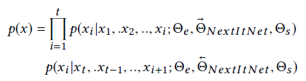 具体来说,数据扩充方法,如改进后的GRU4Rec,利用目标序列的前缀进行数据预处理,生成新的训练子会话,然后由推荐者预测序列中的最后一项。自回归方法以端到端方式对整个序列的分布建模,而不是只对最后一项建模。这个想法导致了一个典型的从左到右风格的单向生成模型,称为NextItNet 。这两种策略具有相似的直觉,即在构建目标交互的预测函数时,只考虑其过去的用户行为(本文也称之为“上下文”)。