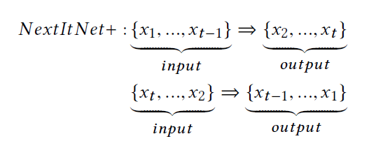 利用未来数据的一种直接方法是反转原始用户输入序列,并通过同时输入和反转输出来训练推荐模型。这种类型的双向数据扩充方法已经在几个NLP任务中得到了有效的验证。基于数据扩充和增强现实方法的推荐模型无需修改即可直接应用。例如,我们通过使用NextItNet(用NextItNet+表示)来展示这个方法,如下所示: