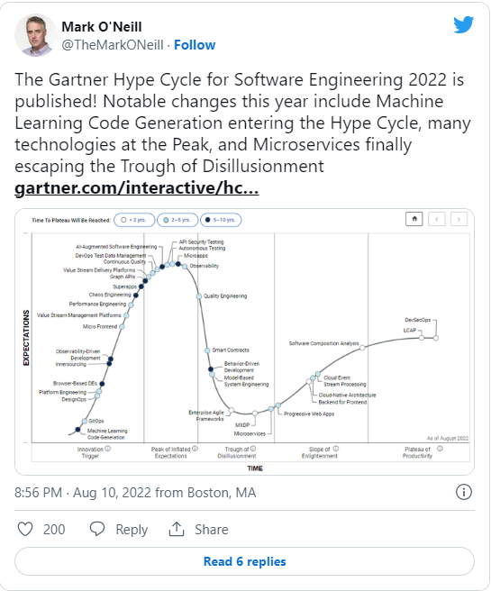 然而,一些优秀的组织在这个问题上找到了答案:平台工程。PlatformCon是第一届面向平台工程师的会议,吸引了6千多名与会者。Gartner在其2022年软件工程技术成熟度曲线中增加了一项:平台工程。