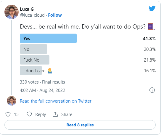 Luca Galante 是平台工程社区的主要贡献者和 Humanitec 的产品负责人,他针对这个主题在推特上展开了一次非正式的民意调查。投票的结果凸显了两大阵营的分歧:41.8%的开发人员表示愿意承担运维的工作,42.1%的开发人员表示反对,还有16.1%则表示无所谓。