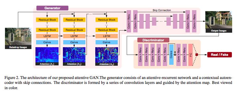 为了解决这个问题,我们使用生成对抗网络(GAN)。在这个网络中,产生的输出将由判别网络(discriminative network)进行评估,以确保输出看起来像真实的图像。为了解决问题的复杂性,生成网络( generative network)首先尝试生成一个注意力图(attention map)。注意力图是这个网络中最重要的部分,因为它将引导生成网络关注雨滴区域。 注意力图由一个循环网络生成,该循环网络由深层残差网络(ResNets)和一个卷积LSTM和几个标准的卷积层组成。我们称之为attentive-recurrent network。