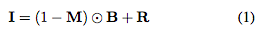 其中I是彩色的输入图像,M是二进制掩码。在掩模中,M(x) = 1表示像素x是雨滴区域的一部分,否则表示它是背景区域的一部分。B表示背景图像,R表示雨滴带来的效果。运算符⊙表示element-wise乘法。