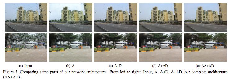总的来说,除了引入一种新的雨滴去除方法外,我们的另一个主要贡献是将注意力图引入到生成网络和判别网络中,这是一种全新的方法,可以有效地去除雨滴。我们将发布代码和数据集。