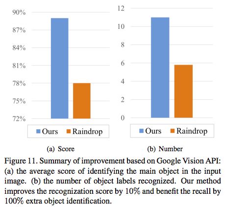 为了进一步证明我们的可见性增强方法对于计算机视觉应用是有用的,我们使用了谷歌视觉API (https://cloud.google.com/vision/)来测试使用我们的输出是否可以提高识别性能。结果如图10所示。