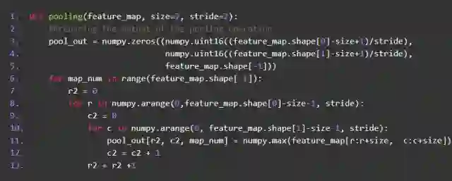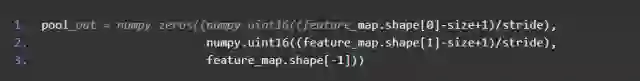 该函数接受3个参数,分别为ReLU层的输出,池化掩膜的大小和步幅。首先也是创建一个空数组,用来保存该函数的输出。数组大小根据输入特征图的尺寸、掩膜大小以及步幅来确定。