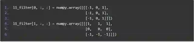 滤波器组的大小由自己指定,但没有给定滤波器中具体的数值,一般采用随机初始化。下列一组值可以用来检查垂直和水平边缘: