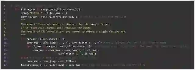 如果输入图像不止一个通道,则滤波器必须具有同样的通道数目。只有这样,卷积过程才能正常进行。最后将每个滤波器的输出求和作为输出特征图。下面的代码检测输入图像的通道数,如果图像只有一个通道,那么一次卷积即可完成整个过程: