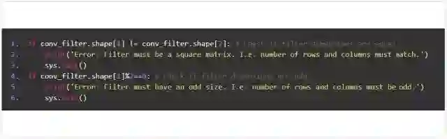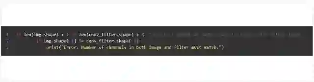 该函数首先确保每个滤波器的深度等于图像通道的数目,代码如下。if语句首先检查图像与滤波器是否有一个深度通道,若存在,则检查其通道数是否相等,如果匹配不成功,则报错。