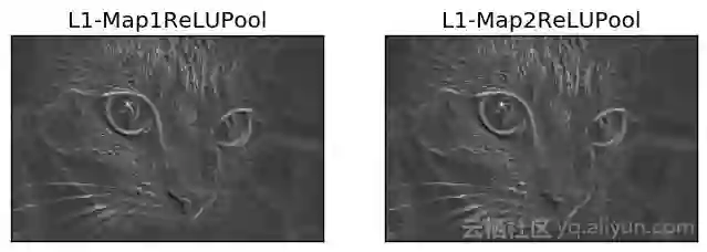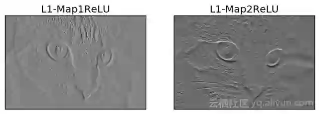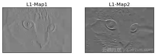 输入图像与每个滤波器卷积后,通过conv函数返回特征图。下图显示conv层返回的特征图(由于l1卷积层的滤波器参数为(2,3,3),即2个3x3大小的卷积核,最终输出2个特征图):