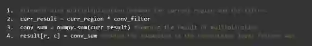 之后,在图像区域矩阵和滤波器之间对位相乘,并将结果求和以得到单值输出: