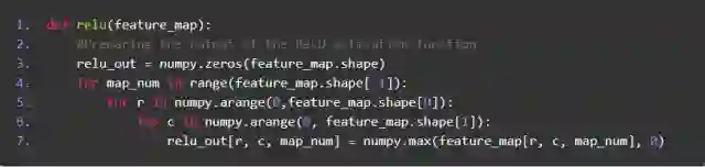 ReLU层将ReLU激活函数应用于conv层输出的每个特征图上,根据以下代码行调用ReLU激活函数: