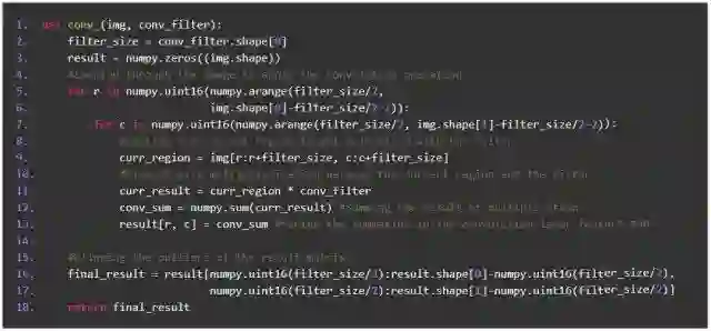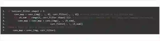 上述代码中conv_函数与之前的conv函数不同,函数conv只接受输入图像和滤波器组这两个参数,本身并不进行卷积操作,它只是设置用于conv_函数执行卷积操作的每一组输入滤波器。下面是conv_函数的实现代码: