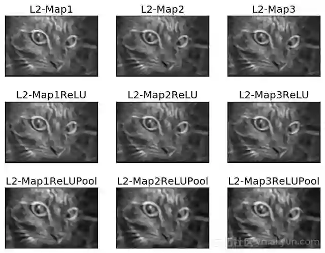 从代码中可以看到,l2表示第二个卷积层,该卷积层使用的卷积核为(3,5,5),即3个5x5大小的卷积核(滤波器)与第一层的输出进行卷积操作,得到3个特征图。后续接着进行ReLU激活函数以及最大池化操作。将每个操作的结果可视化,如下图所示: