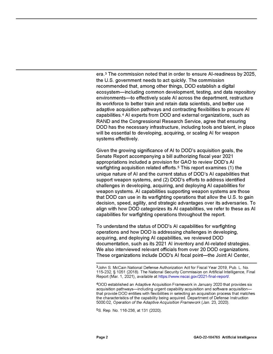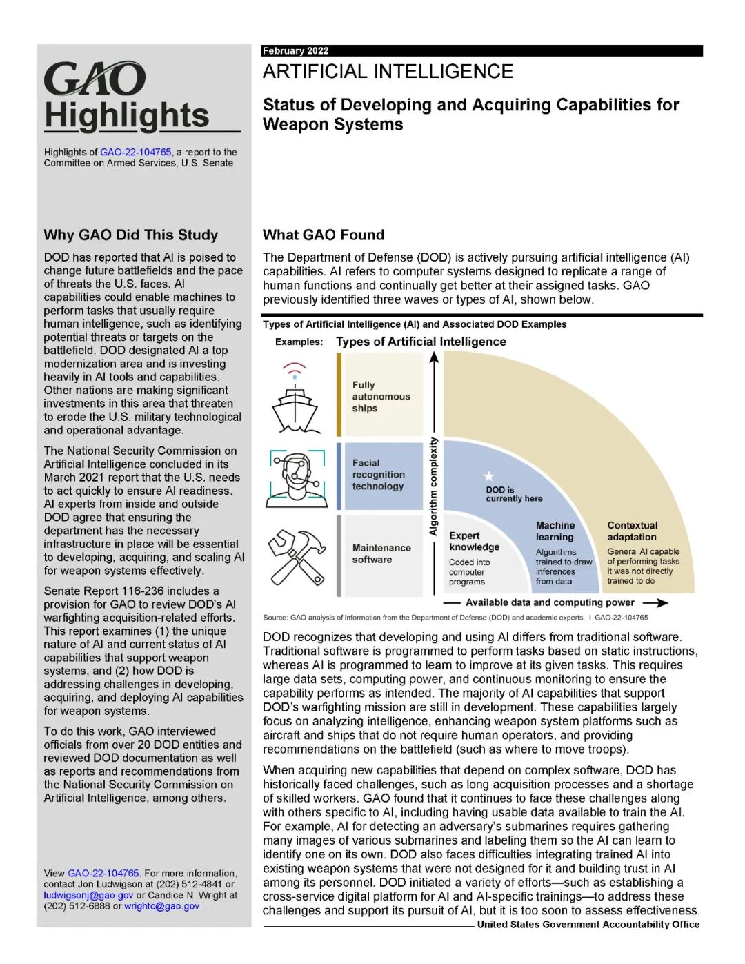 当获取依赖于复杂软件的新能力时,国防部一直面临着挑战,例如长时间的获取过程和熟练工人的短缺。GAO发现,它继续面临这些挑战,同时还面临人工智能特有的其他挑战,包括有可用的数据来训练人工智能。例如,人工智能探测对手的潜艇需要收集各种潜艇的图像,并标记它们,这样人工智能就可以学会自己识别。国防部还面临着将训练有素的人工智能集成到非为其设计的现有武器系统中的困难,以及在其人员中建立对人工智能的信任。国防部发起了一系列努力,如为人工智能和人工智能特定培训建立一个跨服务的数字平台,以应对这些挑战,并支持其对人工智能的追求,但现在评估有效性还为时过早