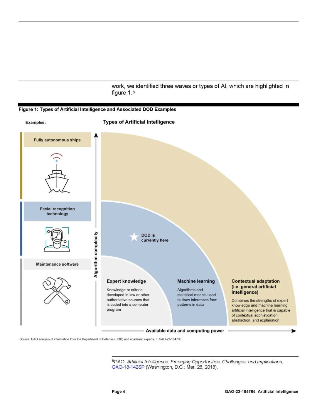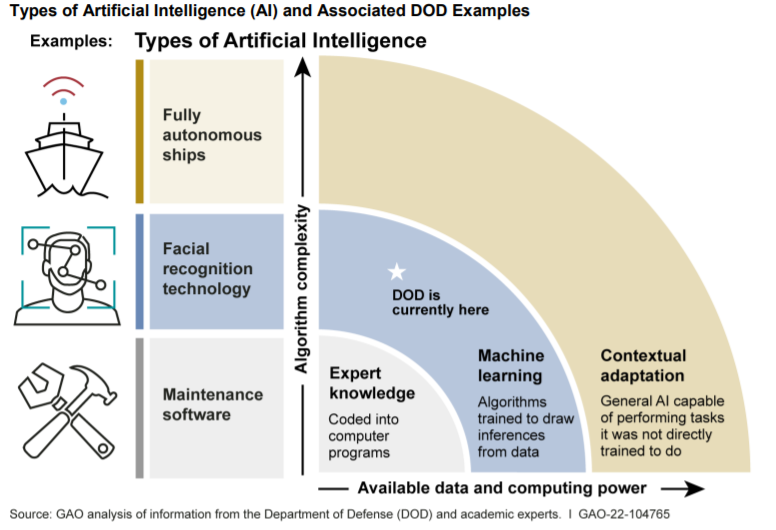美国国防部(DOD)正在积极追求人工智能(AI)能力。人工智能指的是旨在复制一系列人类功能,并不断在分配的任务上做得更好的计算机系统。GAO之前确定了三种AI类型,如下图所示。