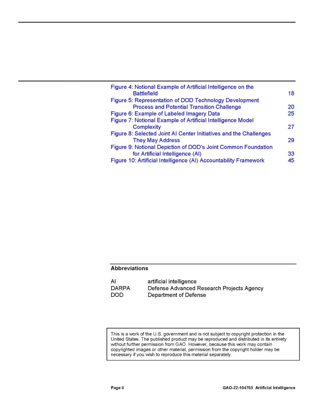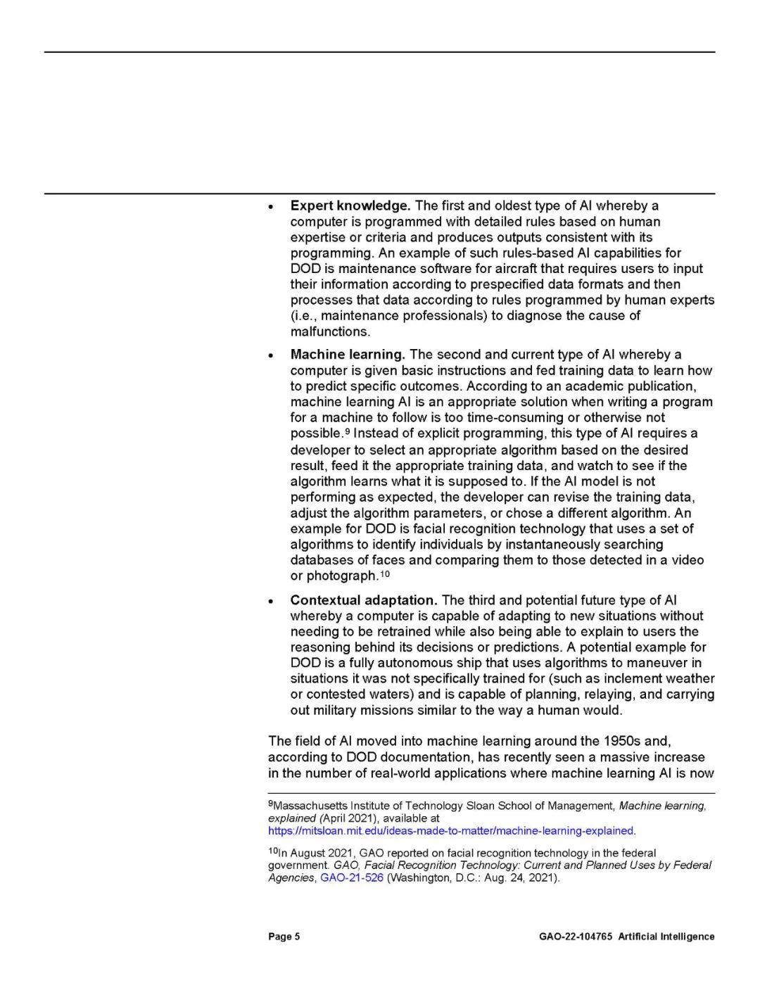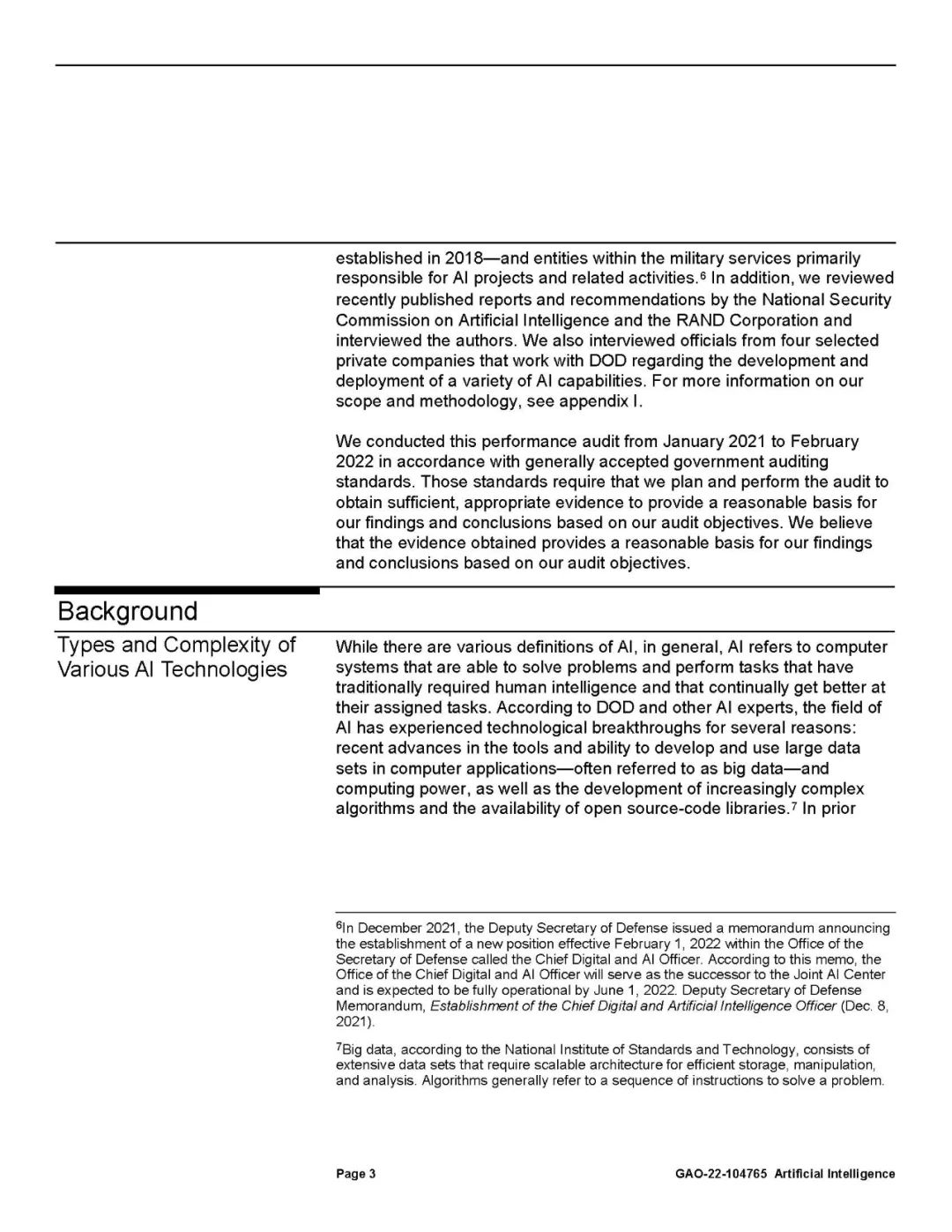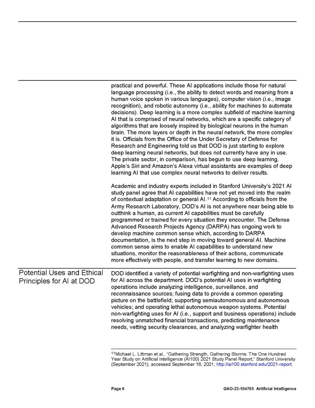 国防部认识到开发和使用人工智能不同于传统软件。传统软件的编程是根据静态指令执行任务,而人工智能的编程则是学习如何改进给定的任务。这需要大量的数据集、计算能力和持续监控,以确保功能按预期执行。支持国防部作战任务的大部分人工智能能力仍在开发中。这些能力主要集中在分析情报,增强武器系统平台,如不需要人工操作的飞机和舰船,并在战场上提供建议(如将部队转移到哪里)。
