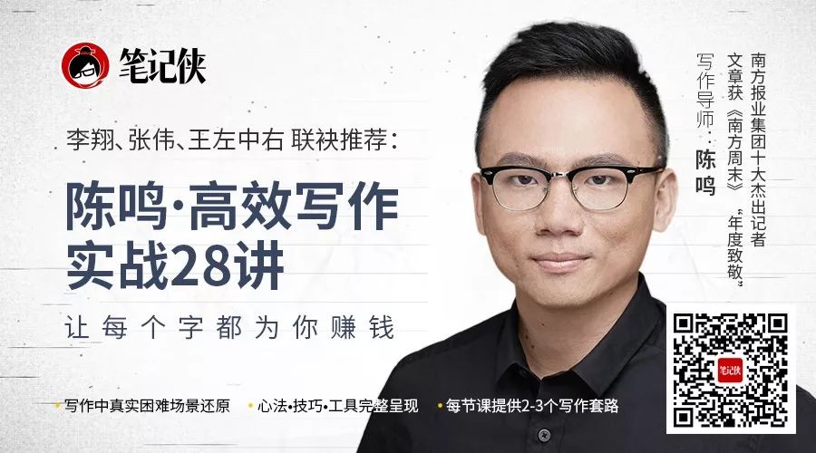 内容来源:这是一个写作无处不在的时代,写作的逻辑可以迁移到任何工作中。笔记侠特别邀请前南方周末年度致敬记者陈鸣,从心法-技巧-工具三个维度分析写作,为日常的工作、学习、生活提供解决方案。