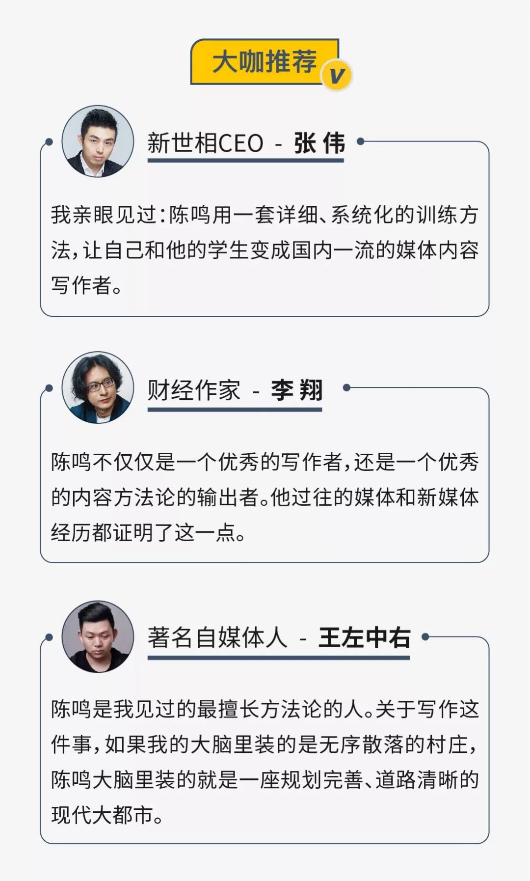 专业的人更会惺惺相惜,这堂爆款写作课《 高效写作实战28讲》也得到了新世相创始人张伟,财经作家李翔,著名自媒体人王左中右等顶级内容人联合推荐。