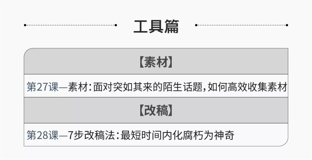 每节课提供2-3个写作技巧,即学即用的写作工具,循序渐进逐一讲解,让你快速掌握写作秘诀。