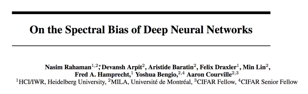 [2]. Nasim Rahaman, Devansh Arpit, Aristide Baratin, Felix Draxler, Min Lin, Fred A. Hamprecht, Yoshua Bengio, Aaron Courville. On the spectral bias of deep neural networks, arXiv preprint arXiv:1806.08734. (First submitted to arXiv Jun 22, 2018)
