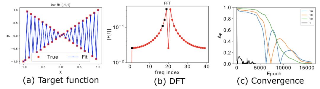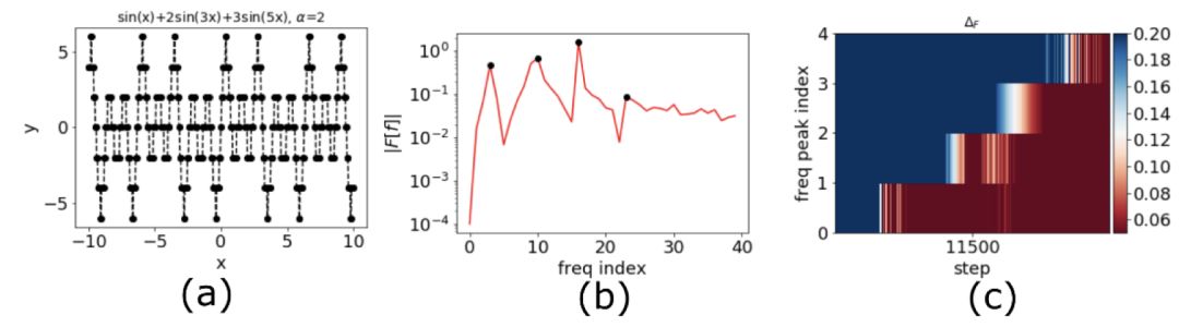 下面是一个一维函数的例子 [1](图 1a 中的黑点),对数据作离散傅里叶变换后如图 1b 所示,考虑图 1b 中的频率峰值(黑点)在训练中的相对误差,如图 1c,频率越高,收敛越慢(蓝色表示相对误差大,红色表示相对误差小)。频率原则可以粗糙地表述成:DNN 在拟合目标函数的过程中,有从低频到高频的先后顺序。(Frequency Principle or F-Principle in [1], or spectral bias in [2])