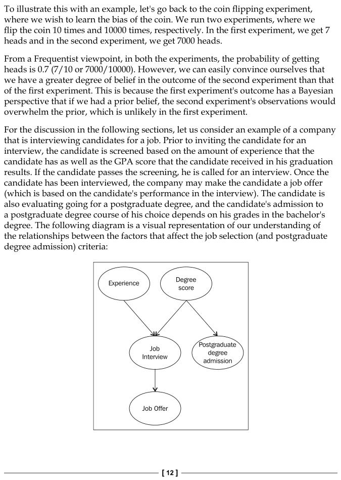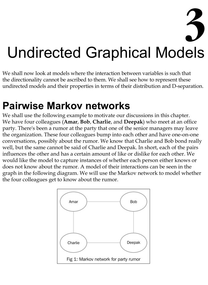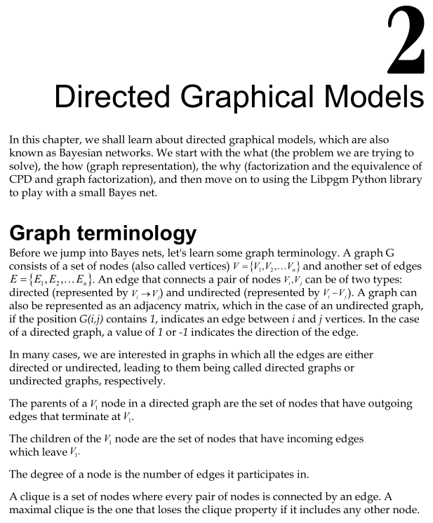 第2章:有向图形模型,提供了关于贝叶斯网络的信息,他们的属性相关的独立性,条件独立性,和D分离。本章使用代码片段加载贝叶斯网络并理解其独立性。