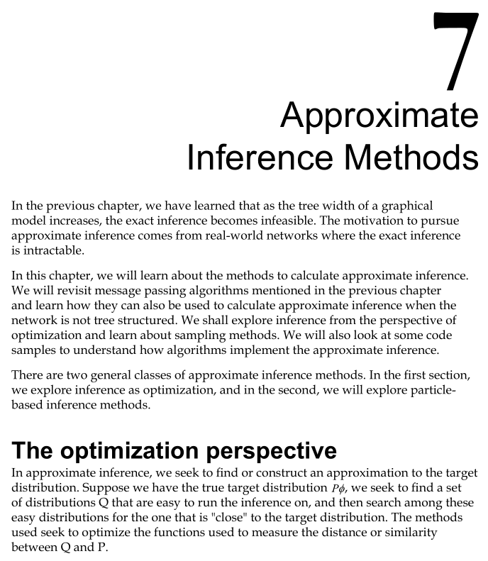 第7章:近似推理方法,探讨了网络太大而无法进行精确推理的近似推理。我们还将通过在马尔科夫网络上使用循环信念传播运行近似推论的代码样本。
