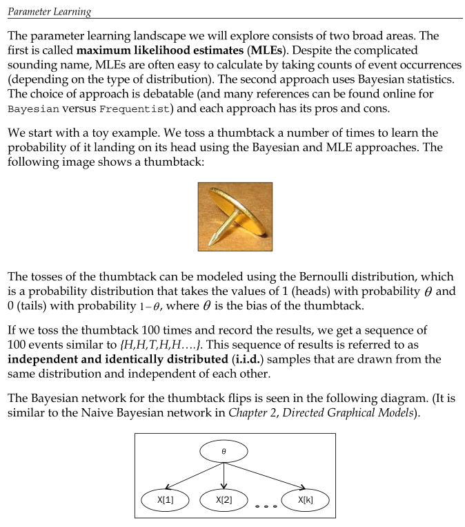第5章:参数学习,介绍了参数学习的最大似然法和贝叶斯方法。