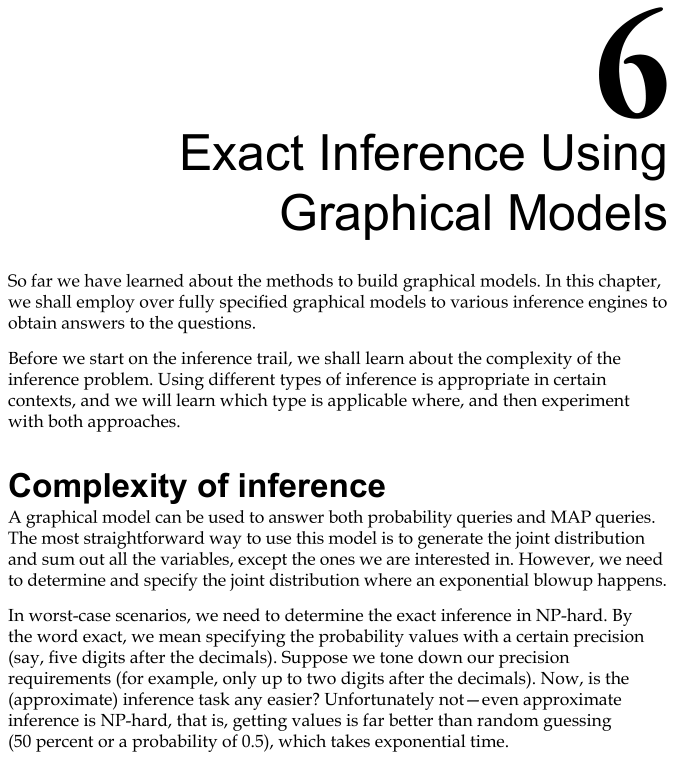 第6章:使用图形模型的精确推理,解释了精确推理的变量消除算法,并探索了使用相同算法回答我们的推理查询的代码片段。