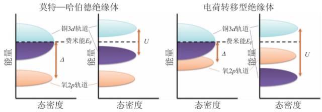 卿本绝缘何导电。话说铜氧化物高温超导材料和大多数过渡金属氧化物一样属于陶瓷材料,其母体一般都是绝缘体。然而根据传统的固体物理理论,材料中费米能附近的电子填充数目决定其导电性(见第五篇《神奇八卦阵》)。铜氧化物这类材料中铜离子含有的电子是半满壳层填充的,也就是说铜离子可以贡献大量的电子到费米能附近,材料中应会充斥大量可以自由导电的电子,理应是导电良好的金属!本该好端端的导电金属,为何实际上却是个绝缘体呢?看来铜氧化物高温超导从母体一开始,就不走寻常路。实际上,早在 1937 年,科学家就注意到了金属电子论的局限性,某些过渡金属氧化物天生就是绝缘体,无法用简单的固体能带理论来解释。N. Mott ( 莫 特) 和 R. Peierls(派尔斯)最早指出之前的理论出错是因为太简单粗暴了,金属电子论过于简化材料中的相互作用为电子与原子实,而忽略了电子之间的相互作用,莫特据此提出了他的理论模型。1963 年,J. Hubbard (哈伯德)简化了莫特的模型,发现:如果电子之间存在较强库仑排斥能U,以致能使得费米能附近本来合为一体的铜离子3d轨道电子,会劈裂成上下两个不同的能带(又称上哈伯德带和下哈伯德带),中间隔着一个电荷能隙。由于电子都填充在下哈伯德带中,空穴都填充在上哈伯德带中,费米能附近就没有可参与导电的载流子,于是绝缘态就形成了 。如此机制形成的绝缘体,又称之为“莫特—哈伯德绝缘体”,或简称“莫特绝缘体”。莫特绝缘体理论在解释氧化物材料的导电机制问题取得了成功,但并不是铜氧化物母体绝缘性的唯一可能解释。例如另一种解释就是电荷转移型绝缘体,这种情况下氧离子和铜离子的轨道距离很近,具有较小的电荷转移能。库仑排斥能使得铜离子3d轨道劈裂的更大,中间隔着氧离子的2p轨道,同样费米能附近没有可参与导电的载流子,属于绝缘体。莫特绝缘体和电荷转移绝缘体之间的区别在于,电子受到的铜离子位库仑排斥能 U(由电子间相互作用决定),和铜—氧离子轨道之间电荷转移能Δ(由离子间电负性差距决定)相比,看谁大谁小。如果U<Δ,意味着电子更倾向于在两铜离子位置之间(不同元胞间)跃迁,属于莫特绝缘体;如果U >Δ,电子则更倾向于在铜—氧离子位置之间(同一元胞内)跃迁,属于电荷转移型绝缘体(图2)。