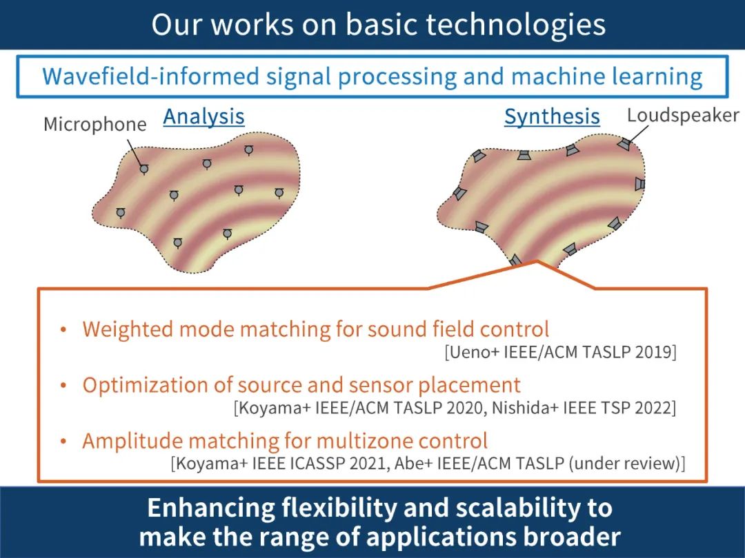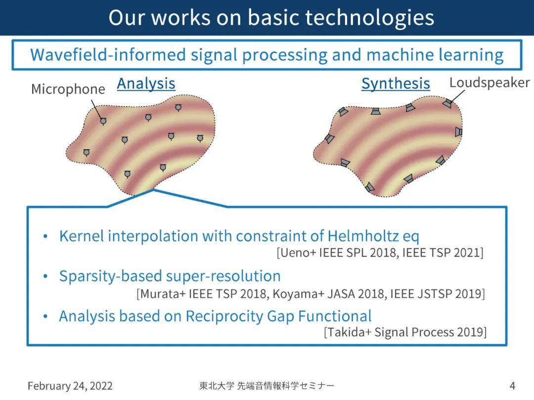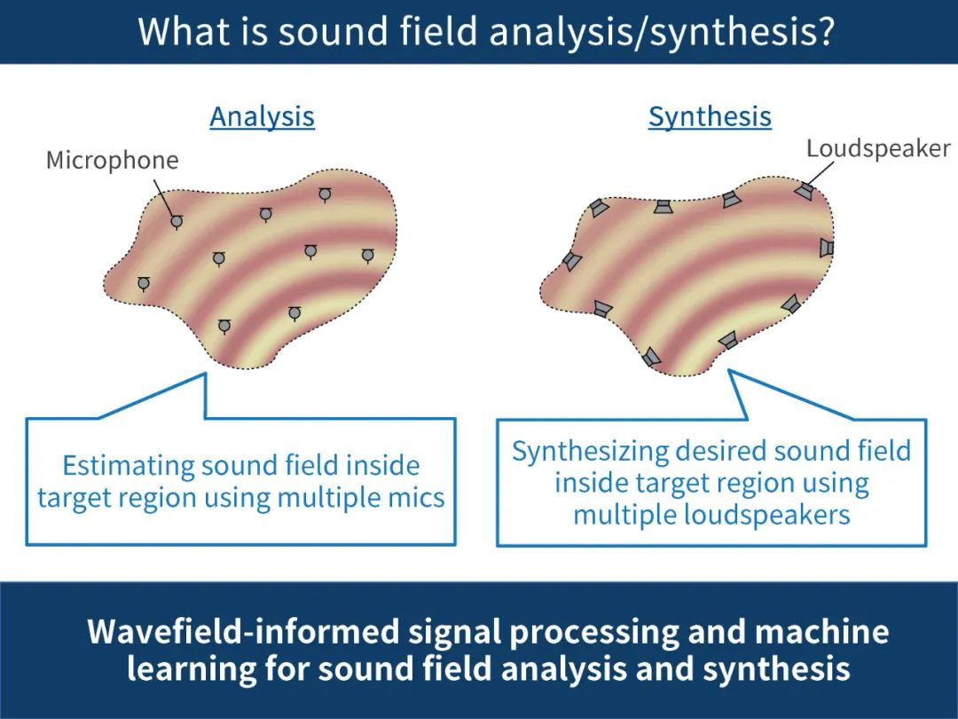 声场估计的研究已有多年。基于波域处理的技术,即即声场的基展开为平面波或球波函数,这是在过去十年中建立的。特别是利用球形传声器阵列进行球形谐波域处理的研究。近年来,波域处理技术已被纳入先进的信号处理和机器学习技术。例如,最近提出了一种基于无限维展开的声场估计方法,它与核方法相对应,并在各种应用中验证了其相对于传统方法的优势。