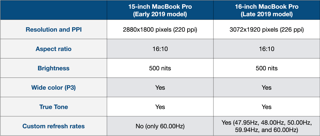 它们之间的一个细微区别是,16 英寸 MacBook Pro 屏幕支持在系统偏好设置中配置新的刷新率,包括 47.95Hz,48.00Hz,50.00Hz,59.94Hz 和 60.00Hz。
