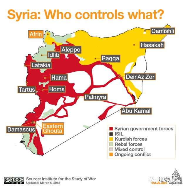 2015年10月,叙利亚政府军控制区仅为一万九千平方公里,在俄军进入叙利亚后进行有效的空中打击后,政府军控制面积逐年递增,如今已达七万八千平方公里,占叙利亚国土总面积的55%。