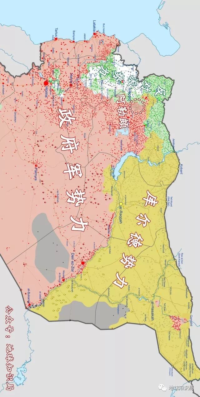俄罗斯和伊朗的兵力部署则相当重合。可以从图上看到俄军和伊朗军的部署密集的集中在西北角的阿勒颇——这里也正是反对派刚刚丢掉的大城市,两支域外力量在阿勒颇攻城战中功不可没。