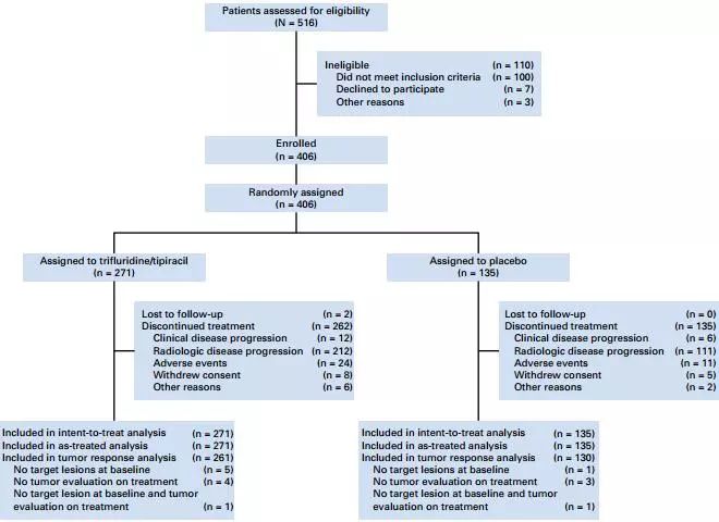 1. 自2013年10月16日至2015年6月15日,入组患者406例,其中TAS-102组271例,安慰剂组135例,见图1。两组KRAS突变率均为63%,TAS-102组和安慰剂组既往接受靶向治疗比例分别为45%和51%,包括抗VEGF治疗(19%对比20%)、抗EGFR治疗(17%对比19%)、两者联合(9%对比13%)。