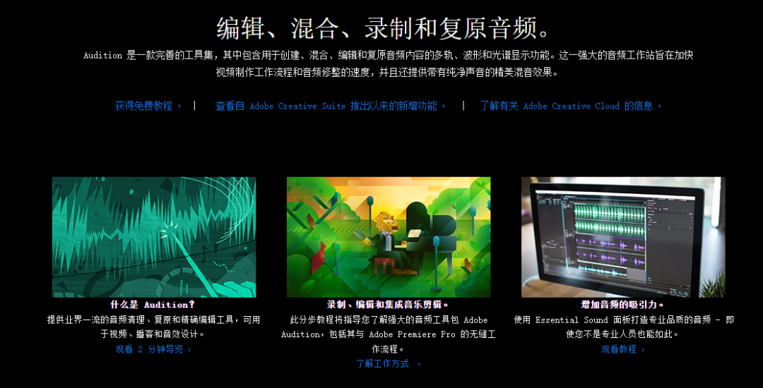 Audition 是一个专业的音频工作站,其中包含用于创建、混合、编辑和复原音频内容的多轨、波形和光谱显示功能,能加快视频制作工作流程和音频修整的速度,并且还提供带有纯净声音的精美混音效果。