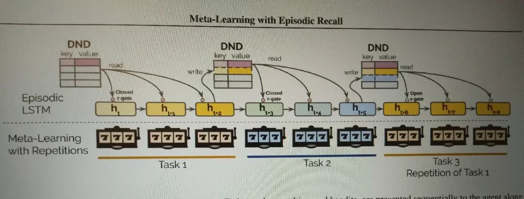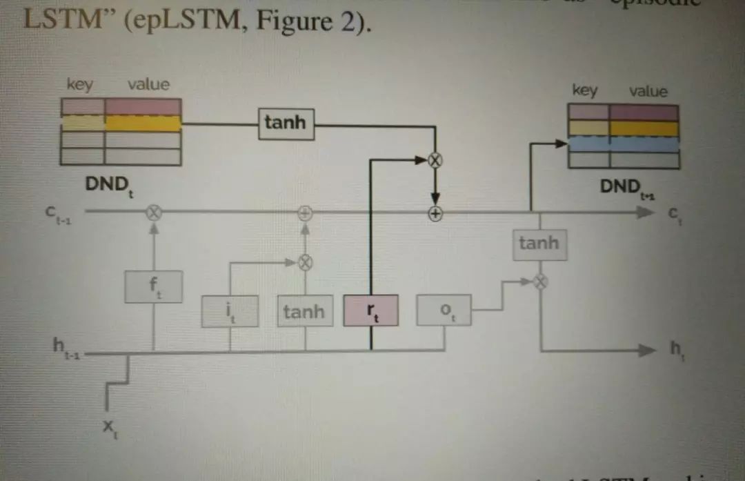 一个标准的LSTM + differentiable neural dictionary(DND)