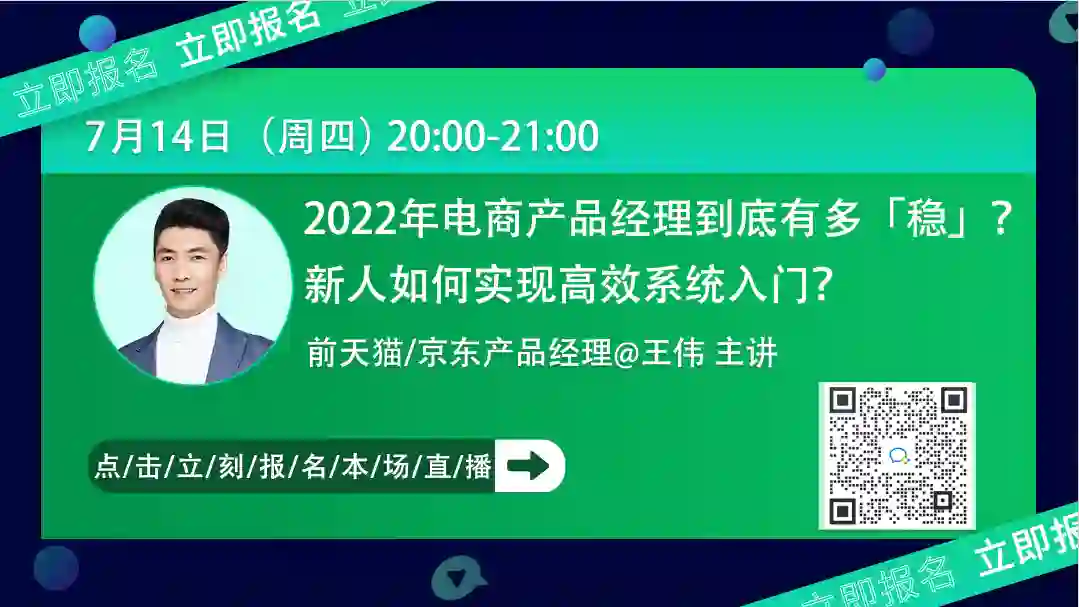 7月14日(周四)晚8点,前天猫/京东产品经理、《电商产品经理》作者@王伟 ,带你剖析电商产品经理的发展前景与工作要点,支招提升电商产品能力,助你高效系统入门电商产品经理!